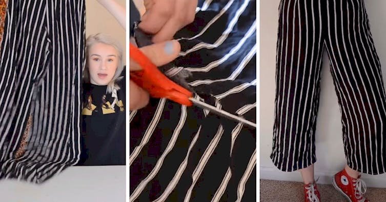 Netrápte sa však! Stačí sa riadiť týmto tipom od Abby Edwardsovej. Dlhé nohavice zo sekáču trochu skrátila a vytvorila z nich rozkošný pár culottes.