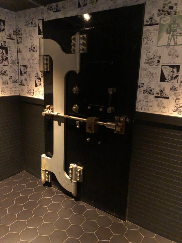 Milujem, keď noví majitelia zachovávajú integritu starej budovy. Táto banka bola prestavaná na reštauráciu a trezor je dverami na pánske toalety.