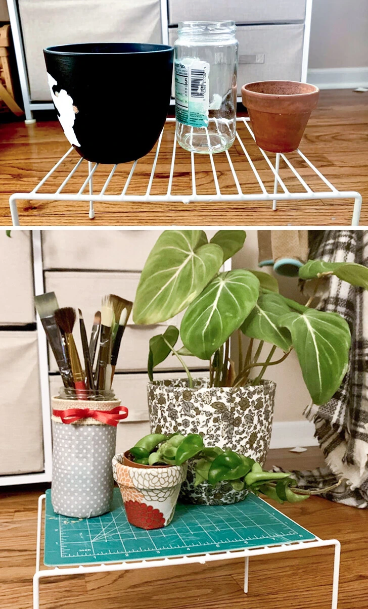 „Dekorovanie látkou je veľmi jednoduchý spôsob, ako znovu využiť staré hrnce a nádoby. Pred a po!“