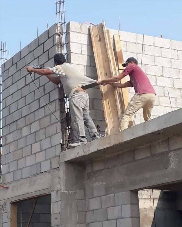 Muž držiaci dvoch ďalších mužov za členky: Technická úroveň = NIE