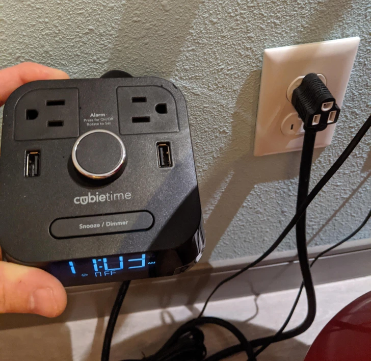 „Tento budík: 2 USB porty, 2 zásuvky“
