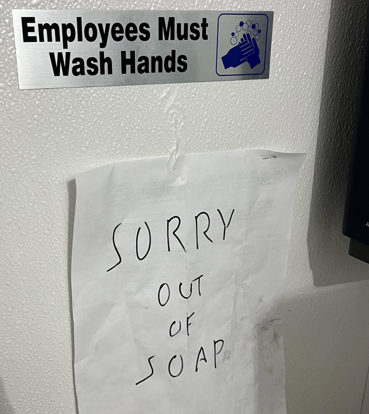 7. “Zamestnanci si musia umývať ruky” – “Prepáčte, mydlo došlo”
