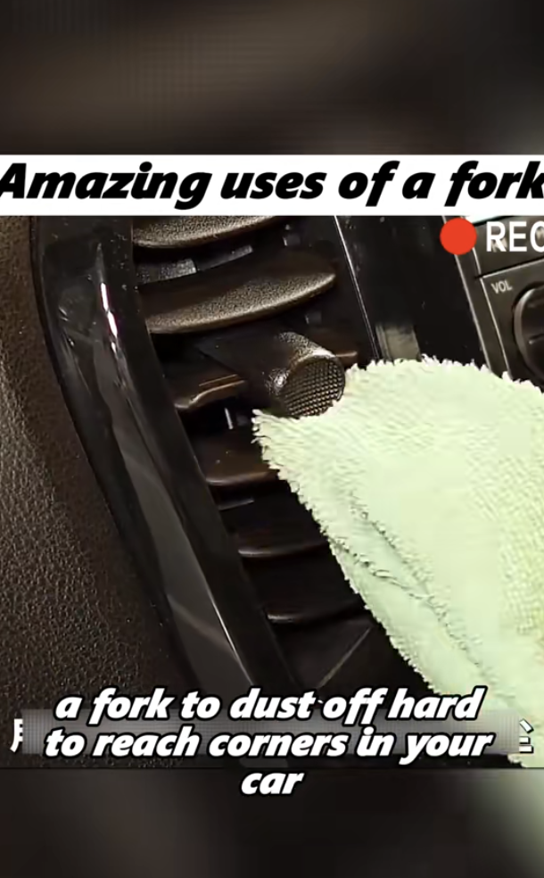 Použitie vidličky môže byť užitočné, ak sa snažíte vyčistiť ťažko dostupné miesta, ako sú vetracie otvory a iné zákutia a štrbiny. Na vidličku položte handričku alebo utierku a potom odstráňte prach a vyčistite tieto miesta. Toto je skvelé pre vetracie otvory klimatizácie vo vašom aute a iné miesta s malými otvormi.