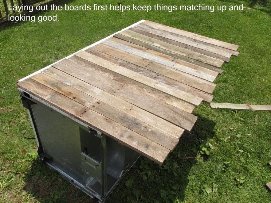 Po dokončení maľovania je ďalším krokom zakrytie bokov, hornej a spodnej časti chladničky, ako aj dvierok recyklovaným paletovým drevom.