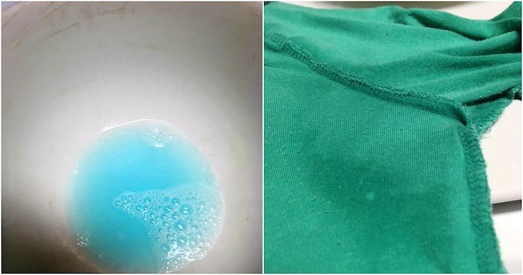 Niekedy môžu byť podpazušie vašich tričiek prepotené, aj keď sú suché a čisté. Ide o nánosy z dezodorantu. Zmiešajte rovnaké diely mydla na riad a teplej vody, pridajte trošku sódy bikarbóny a pred vhodením do práčky škvrnu rozotrite.