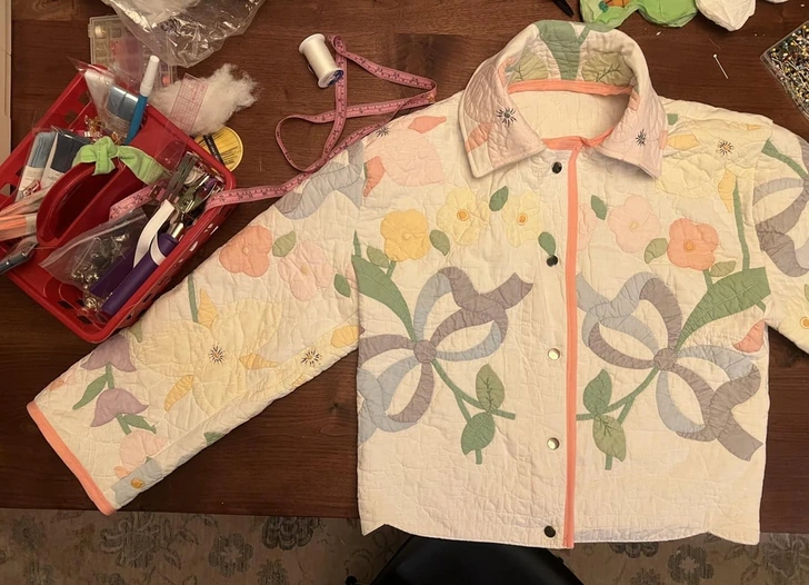 Tento týždeň bol týždňom zlepšovania mojich základných šijacích zručností šitím prešívaného oblečenia z prešívaných prikrývok zo second handu. Túto bundu som včera večer ušila pre kamarátku.