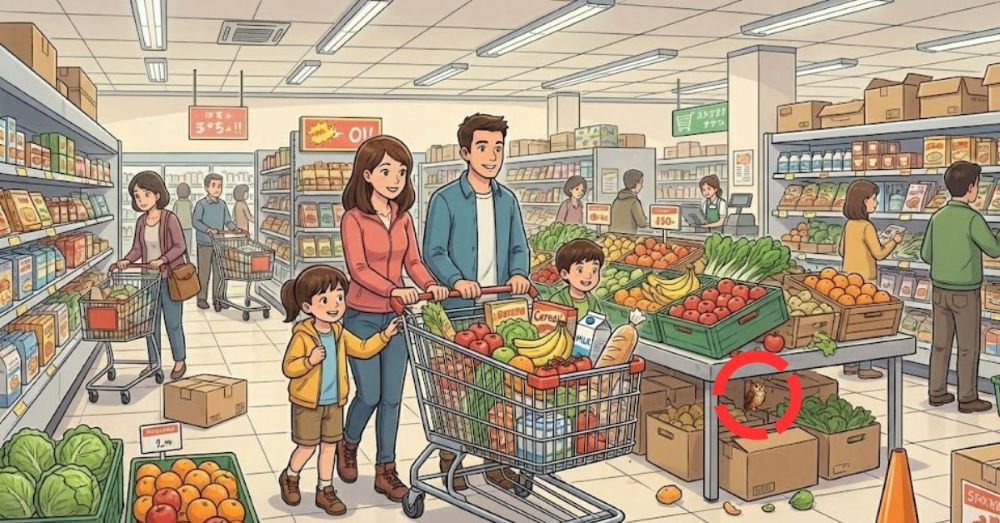 Nasledujúci obrázok vám ukáže presnú polohu sovy, ktorú ste možno prehliadli. Je zaujímavé, ako je mozog schopný ignorovať detaily priamo pred očami, pokiaľ sú zakamuflované v správnom prostredí. Automaticky sa zameriavame na „dôležité“ objekty – ľudí, pohyb, výrazné farby – a preto malé tvary ako sova v supermarkete ľahko uniknú.