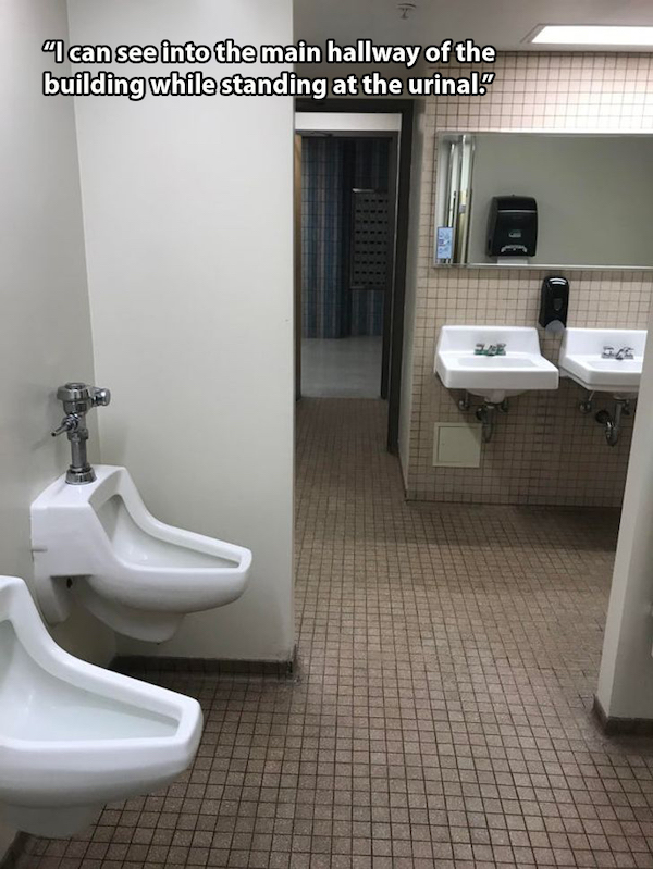 Verejné toalety. Ak niekto nezavrie dvere, tak okoloidúci vidí priamo na nás počas vykonávania potreby.