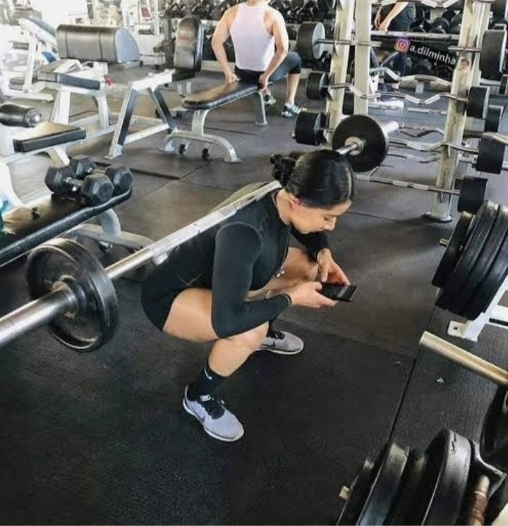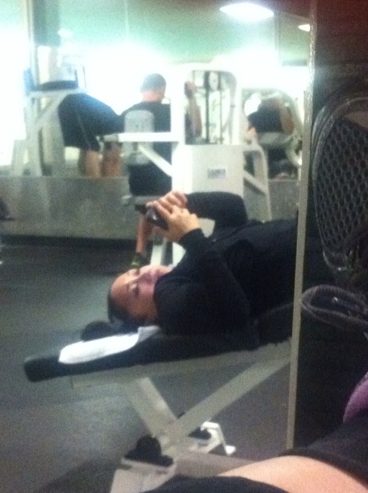 Žena leží v posilňovni a používa telefón, spálila nulové kalórie a prešla tisíce.