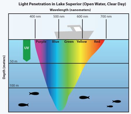 - Hlboká voda pôsobí sýto modro, pretože absorbuje viac červeného svetla