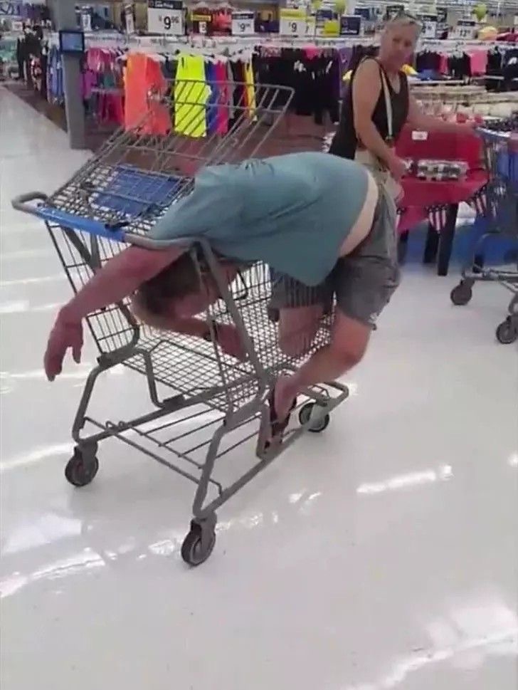 Muž uviaznutý v nákupnom košíku vyvoláva viac otázok než odpovedí.