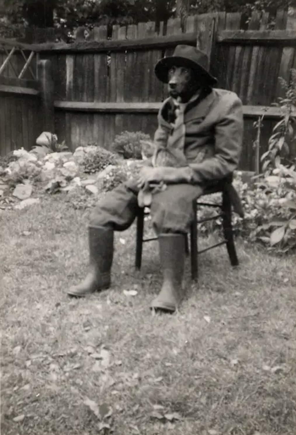 Služobný pes s mačkou na kolenách na začiatku 20. storočia okolo roku 1900.
