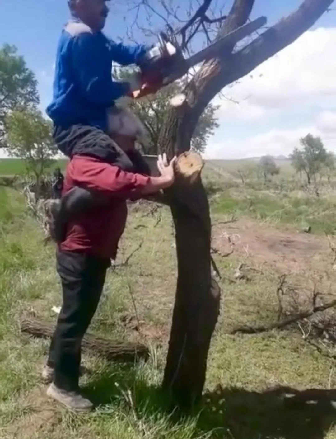 Muž s motorovou pílou ignoruje zákony fyziky a čaká na prekvapenie, ktoré príde pri páde konára.
