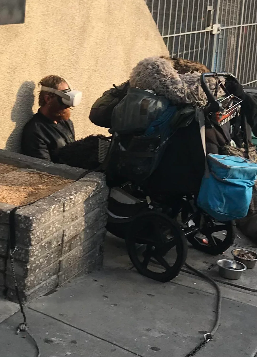 Bezdomovec s VR headsetom na hlave ako symbol zvláštneho a rozporuplného sveta, v ktorom žijeme.
