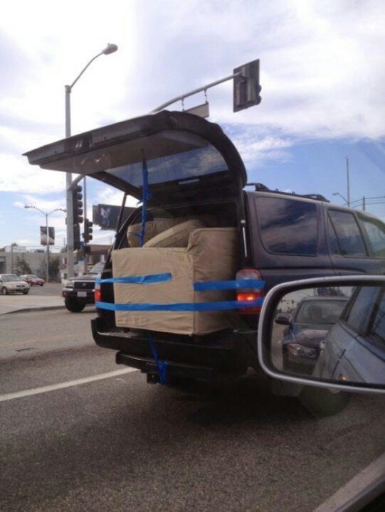 12. Pohovka pripevnená lepiacou páskou vyvoláva otázku, či bezpečnostné normy vôbec niekedy existovali.