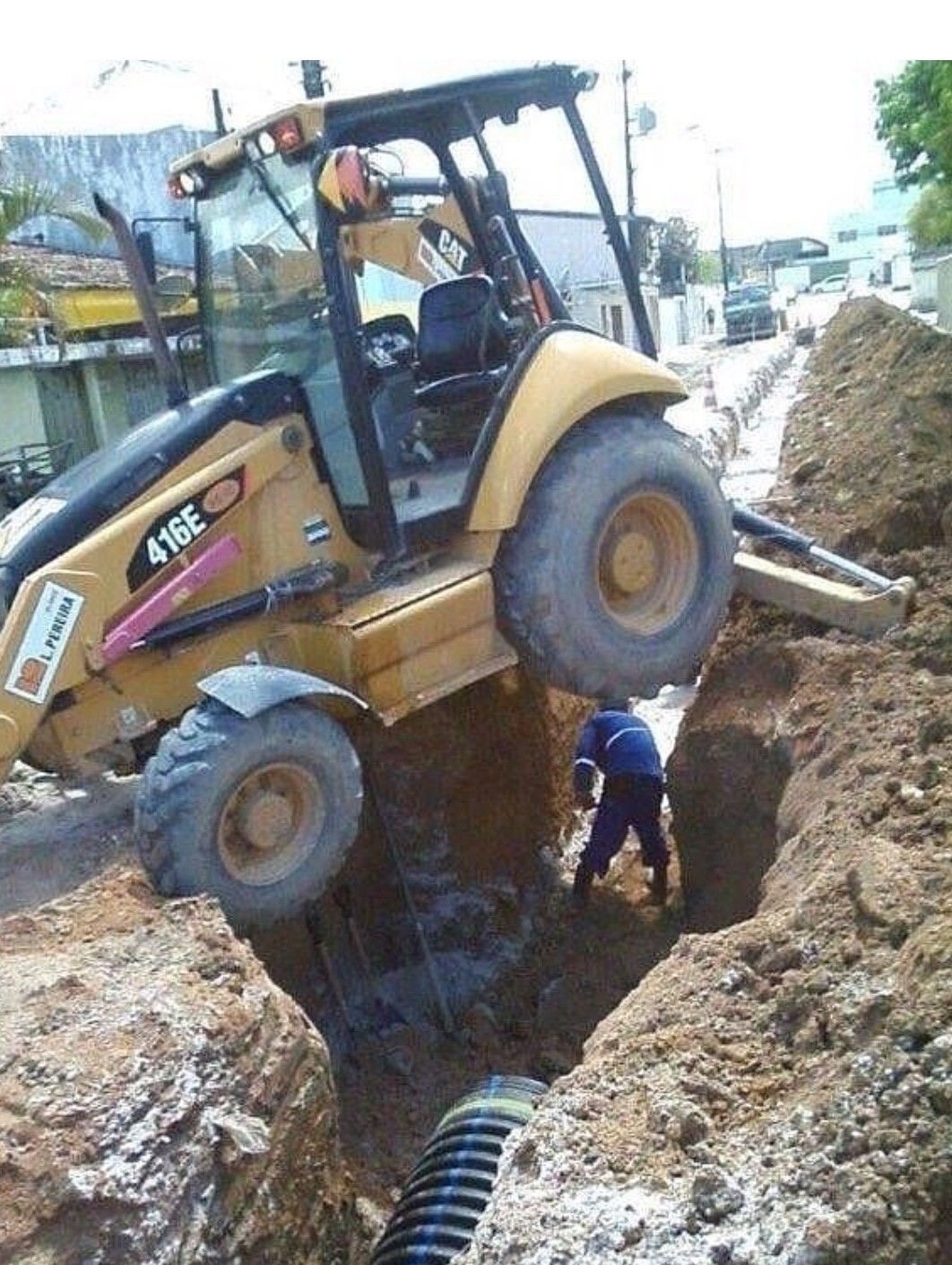 Zaseknutý bager sa stal trvalou súčasťou pracoviska a neželanou atrakciou pre okoloidúcich. Chlapík pod bagrom zrejme nemá pud sebazáchovy.