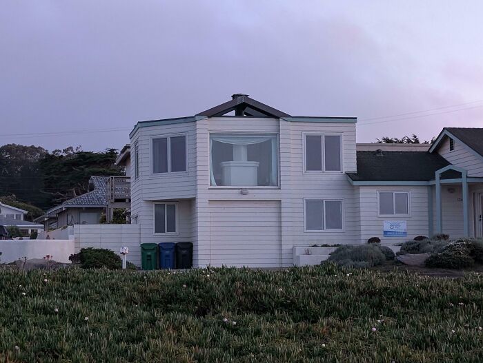 Plážový dom s nádherným výhľadom, ktorý je však úplne zablokovaný masívnym krbom stojacim priamo oproti oceánu.