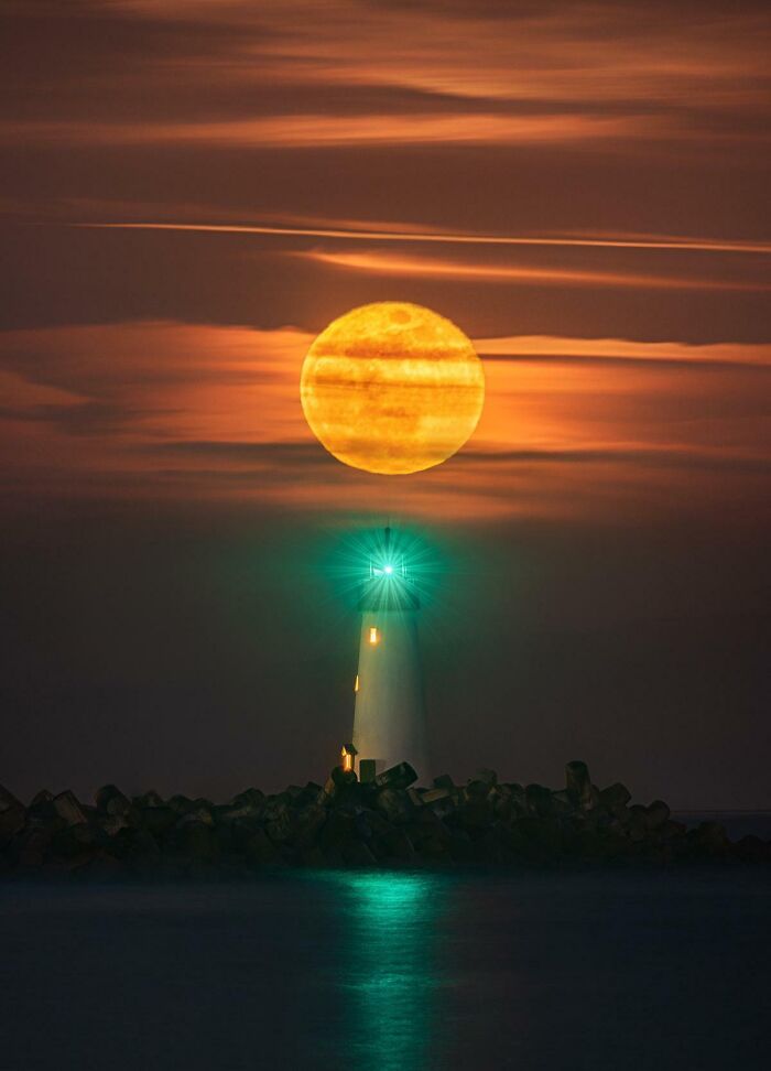 Supermesiac zachytený nad majákom Walton v Santa Cruz pôsobí obrovsky a dramaticky vďaka presnému zarovnaniu objektov.