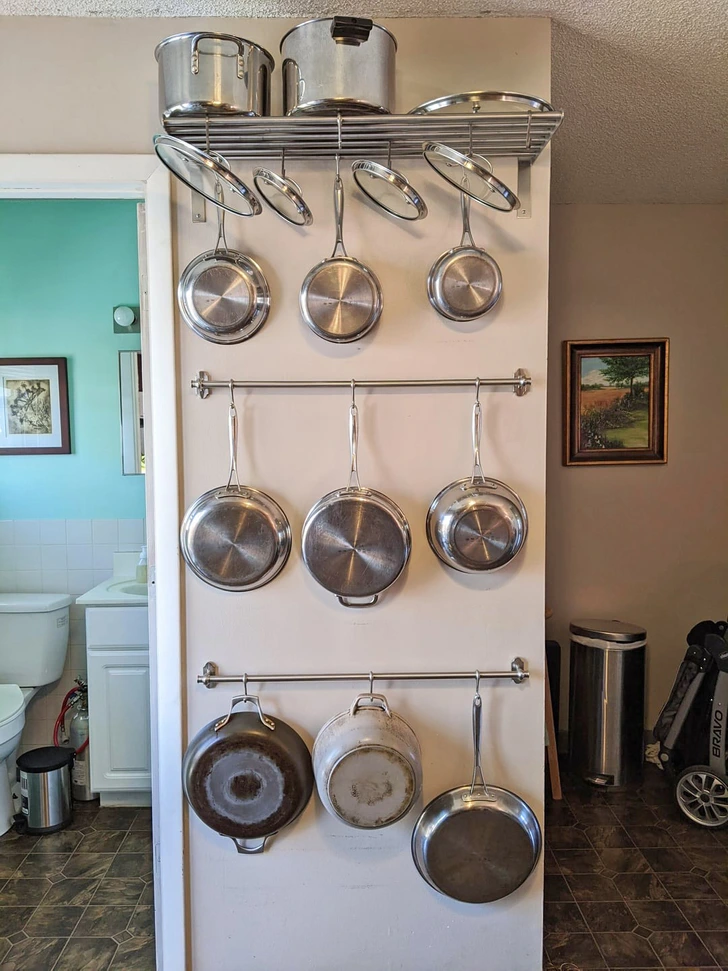 Závesný stojan na hrnce v malej kuchyni, ktorý šetrí miesto a zároveň pôsobí dekoratívne.