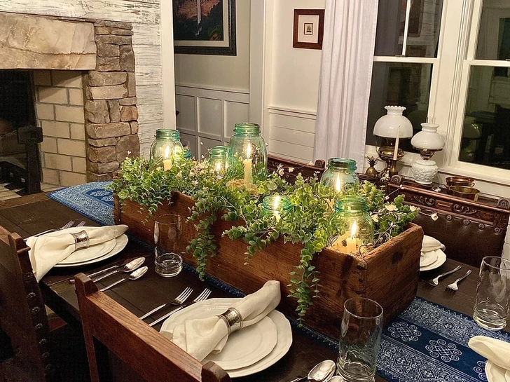 Stredový diel stola vyrobený z drevenej krabice na náradie pradeda a sklenených nádob starej mamy, ktorý spája dizajn s rodinnou históriou.