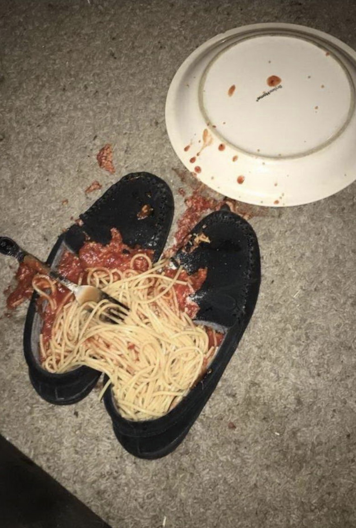 Fotografia zachytáva cestoviny, ktoré si našli cestu na topánky a zrušili večeru aj schôdzu zároveň.
