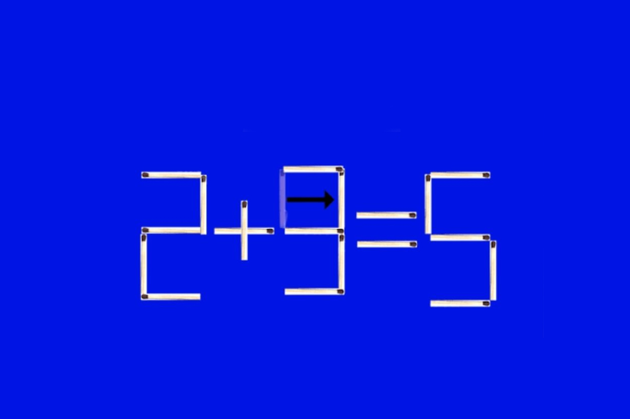 Riešenie spočíva v úprave čísla 5 na ľavej strane rovnice. Presunutím jednej zápalky z tohto čísla ho zmeníte na 3.
