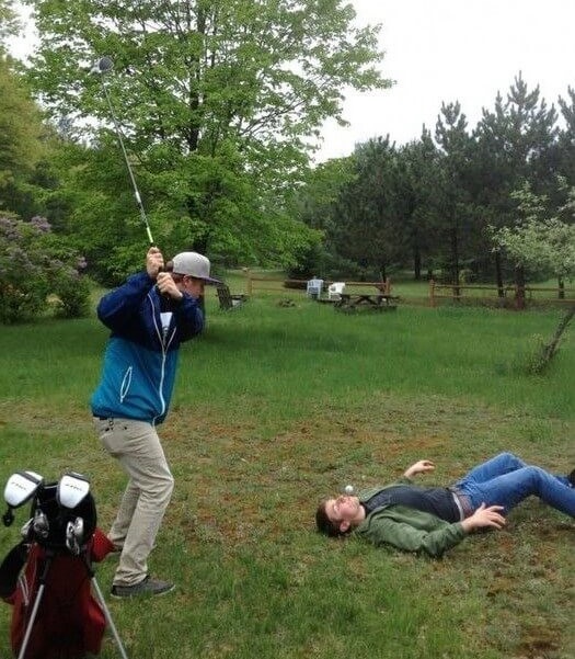 Skupina kamarátov skúša nebezpečný trik s golfovou palicou, ktorý môže veľmi rýchlo skončiť bolestivým úderom do tváre.