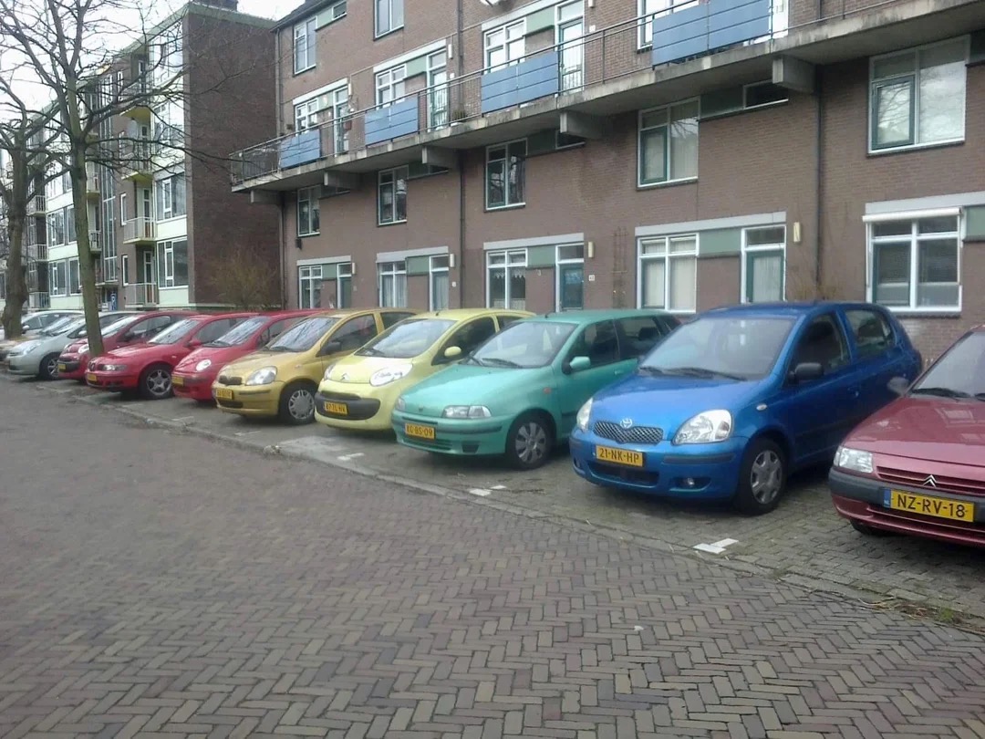 Autá zaparkované za sebou vytvárajú plynulý farebný prechod ako dúha na kolesách.