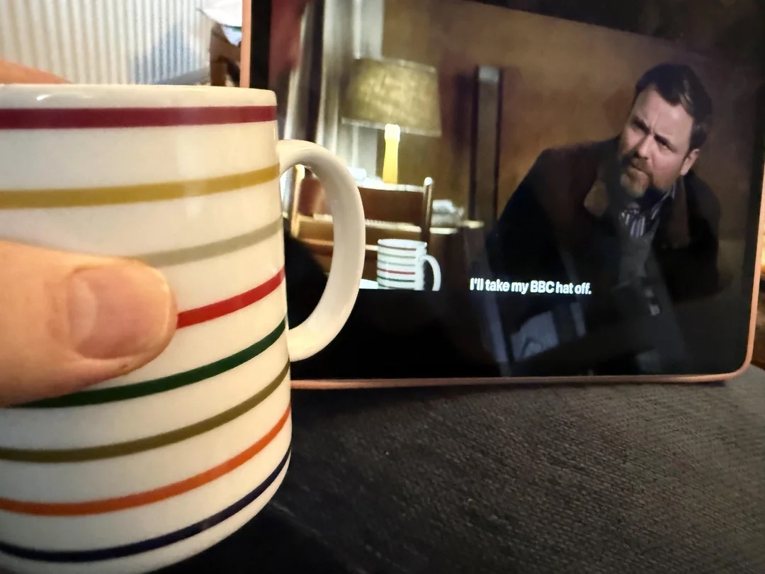 Muž sleduje televíziu a na obrazovke sa objaví presne ten istý pohár, z akého práve pije.