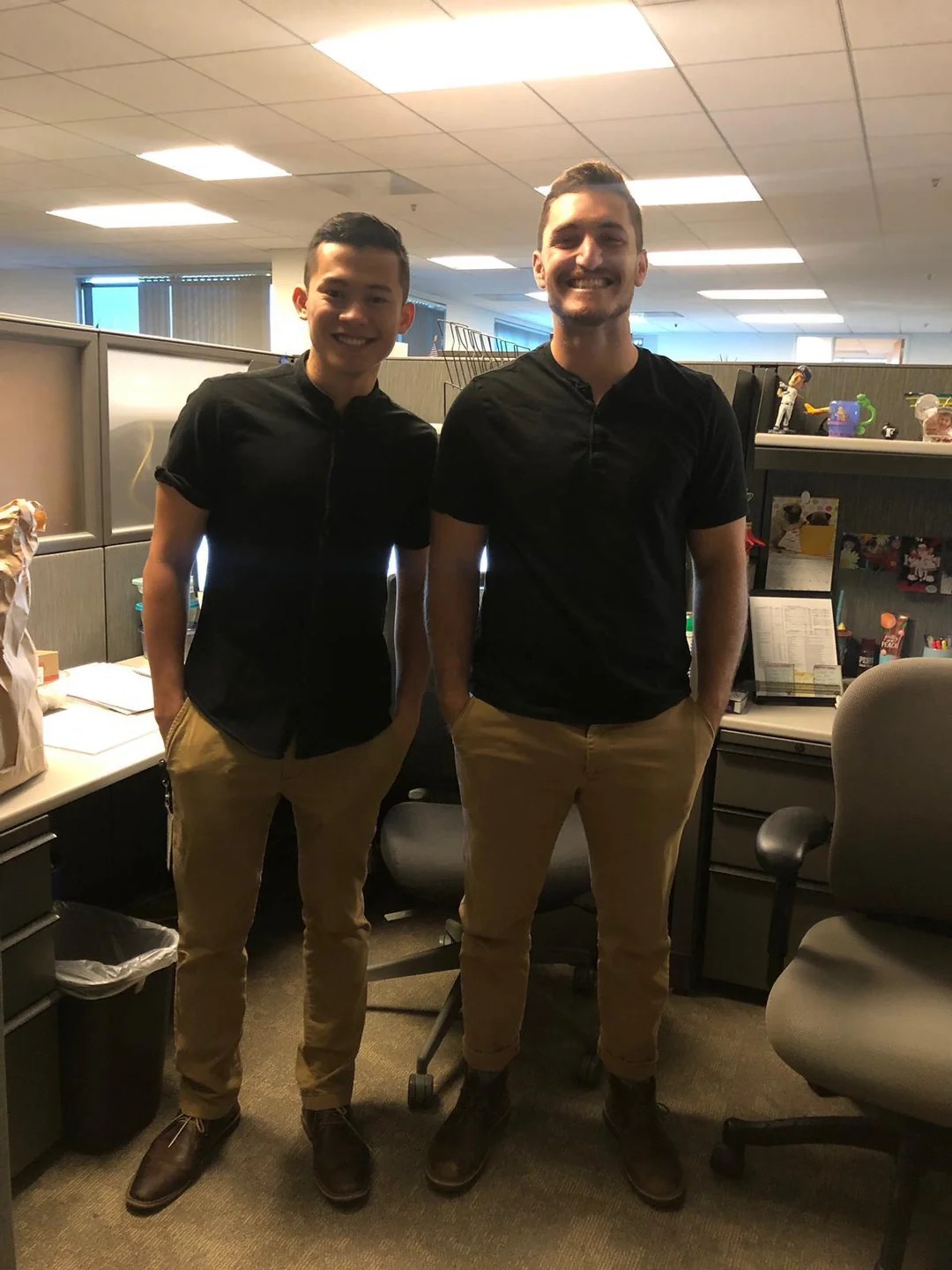Dvaja kolegovia sa objavili oblečení úplne rovnako vrátane identických topánok.