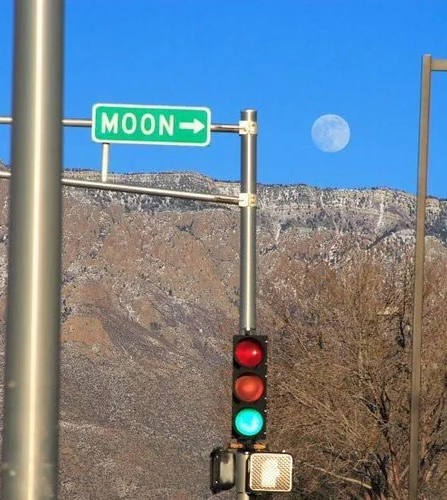 Dopravná značka presne smeruje na mesiac na oblohe, čo vytvára ilúziu premyslenej kompozície.