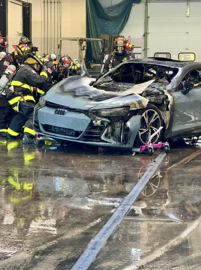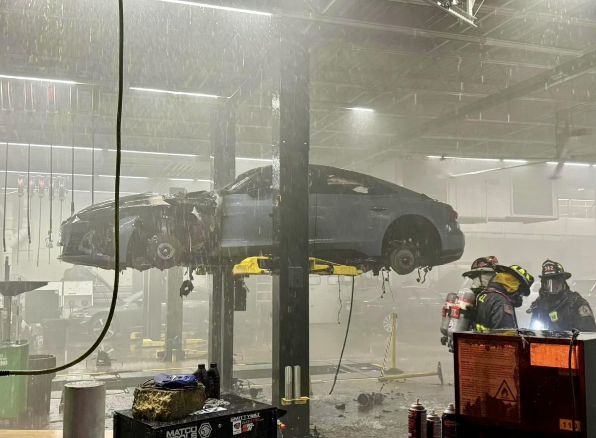 Požiar auta v autoservise – zachytený okamih po