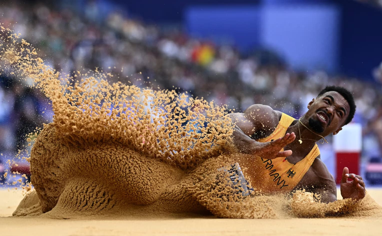 Nemecký atlét Leo Neugebauer je zachytený v momente dopadu pri skoku do diaľky s tvárou plnou napätia.