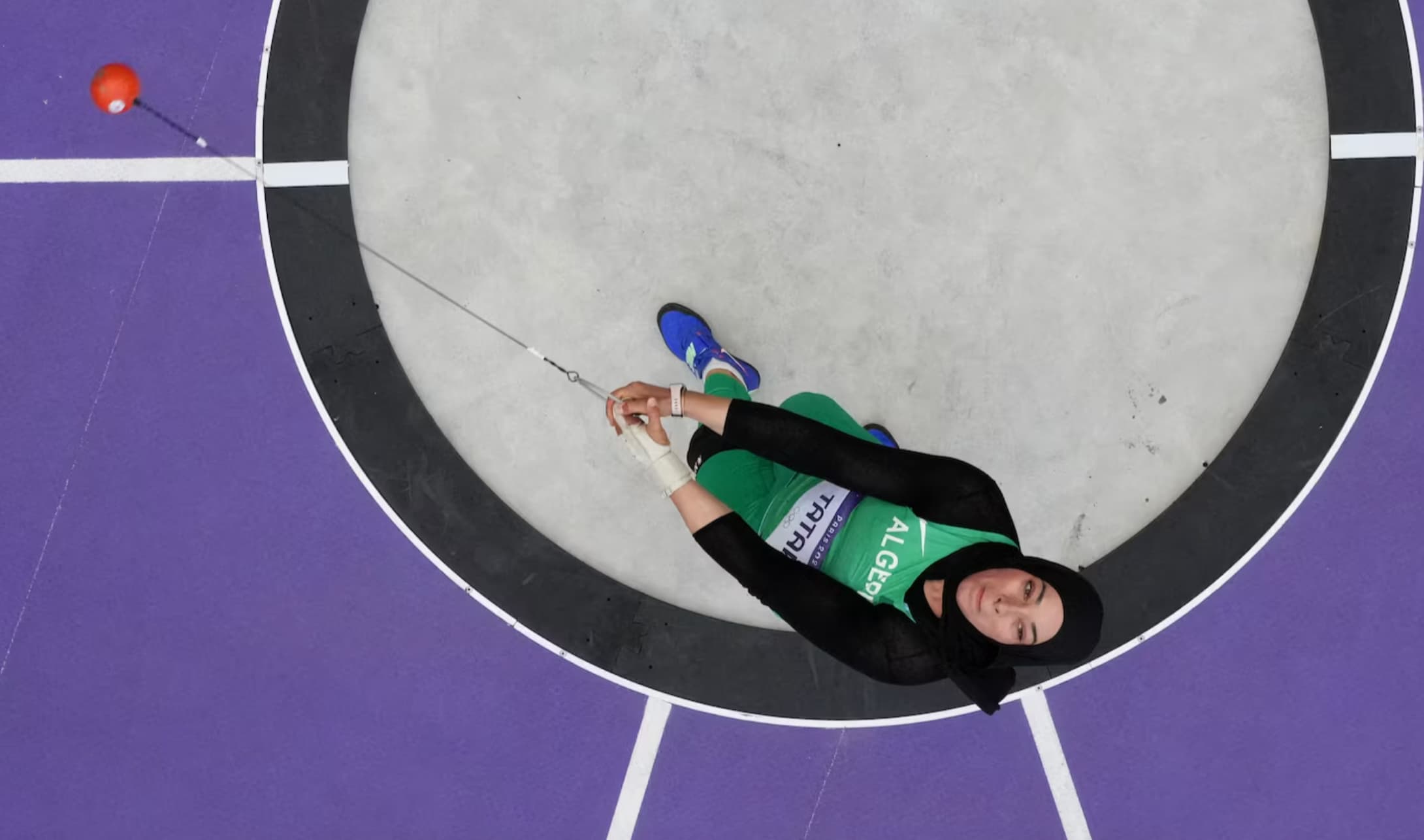 Alžírska kladivárka Zahra Tata súťaží v kvalifikačnom kole s výrazom absolútnej koncentrácie na techniku hodu.