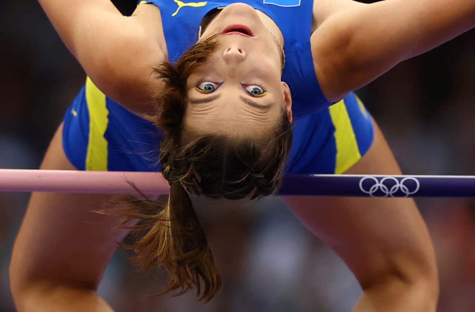 Ukrajinská výškarka Jaroslava Mahučikhová vo finále skoku do výšky žien ukazuje odhodlanie prekonať latku aj vlastné limity.