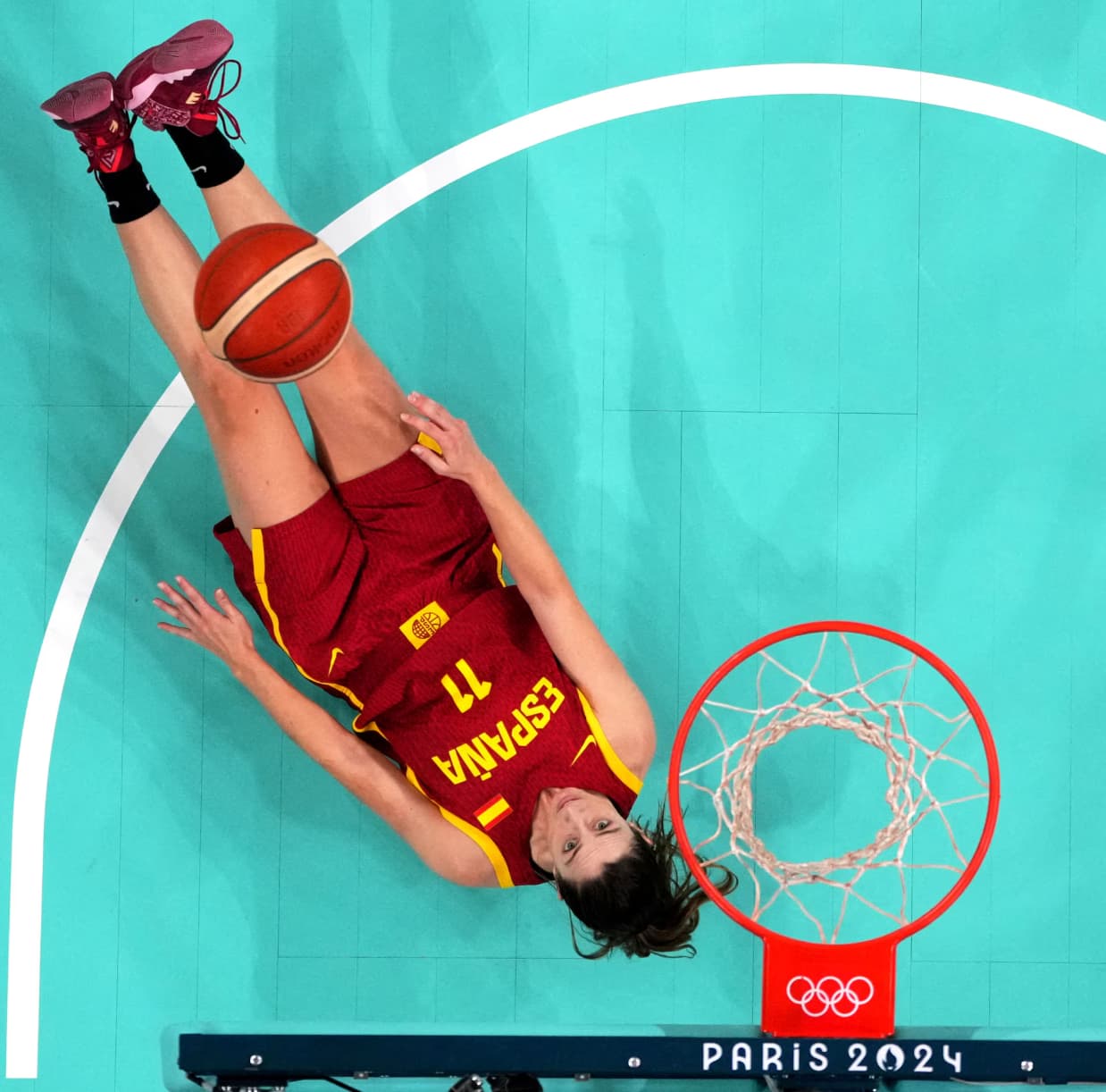 Španielska basketbalistka Leonor Rodriguezová sa pošmykne počas zápasu proti Portoriku, pričom jej tvár odráža frustráciu z nečakaného pádu.