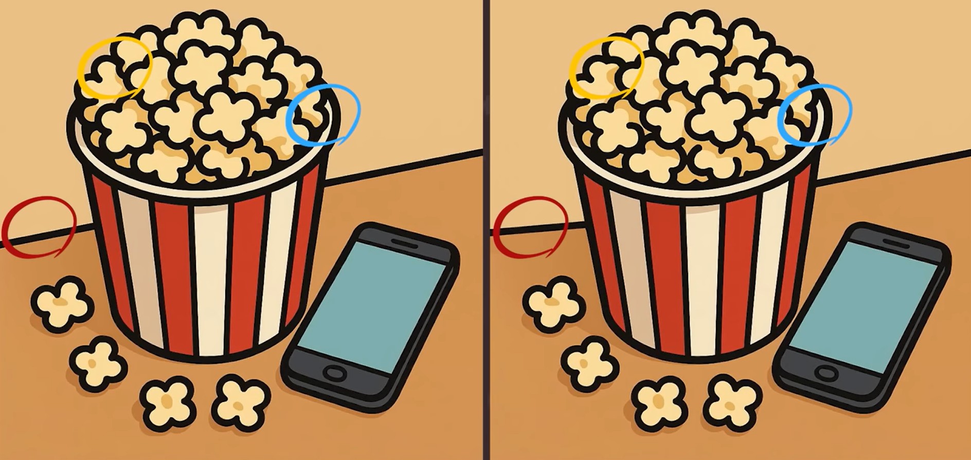 Vidíte už prvý rozdiel? Možno ide o chýbajúci detail alebo jemnú zmenu farby. Zostaňte sústredený – druhý rozdiel môže byť nenápadný tvarový rozdiel. Ste v polovici! Nestrácajte pozornosť a prejdite očami celú scénu ešte raz. Zostáva posledný rozdiel. Skúste sa zamerať na malé detaily na pozadí.