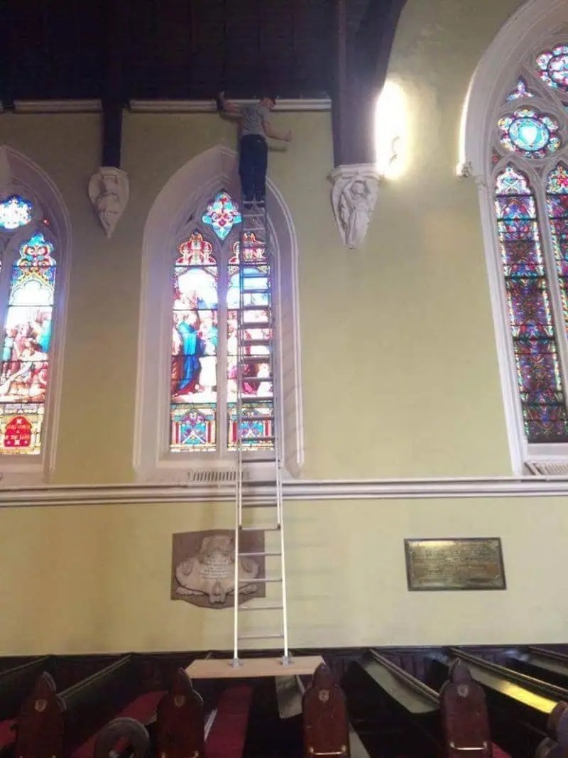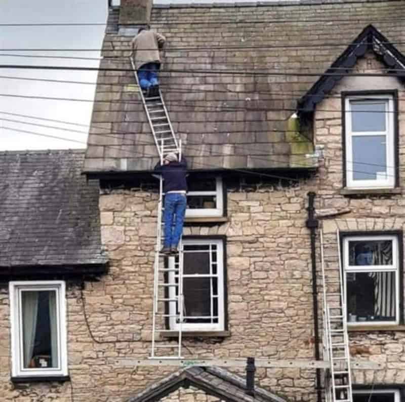 Použitie dvoch rebríkov naraz v extrémne nestabilnej polohe ukazuje, že niekedy ľudia stavajú viac na odvahe než na bezpečnosti.