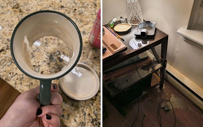 Odpadla mi spodná časť hrnčeka. Čaj bol všade