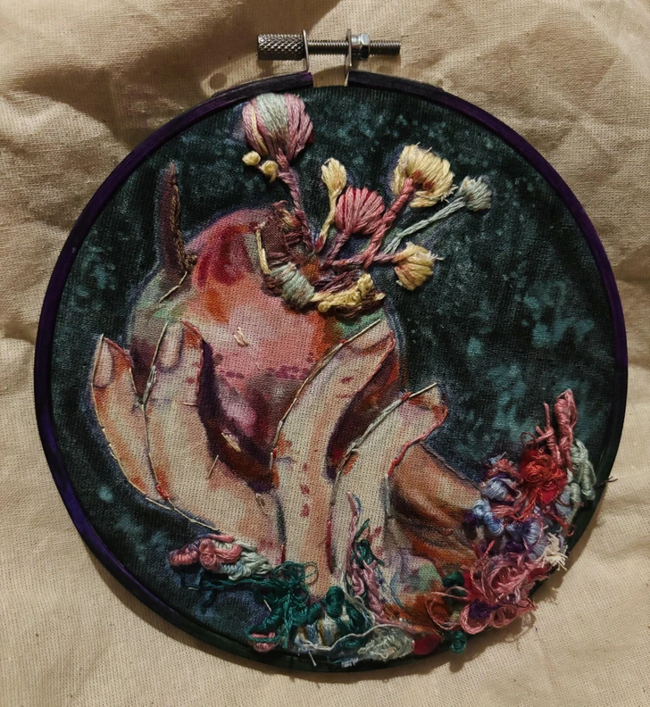 Vyšívanie zmiešanou technikou podľa mojej kresby. Dielo sa volá „Po uhryznutí“.