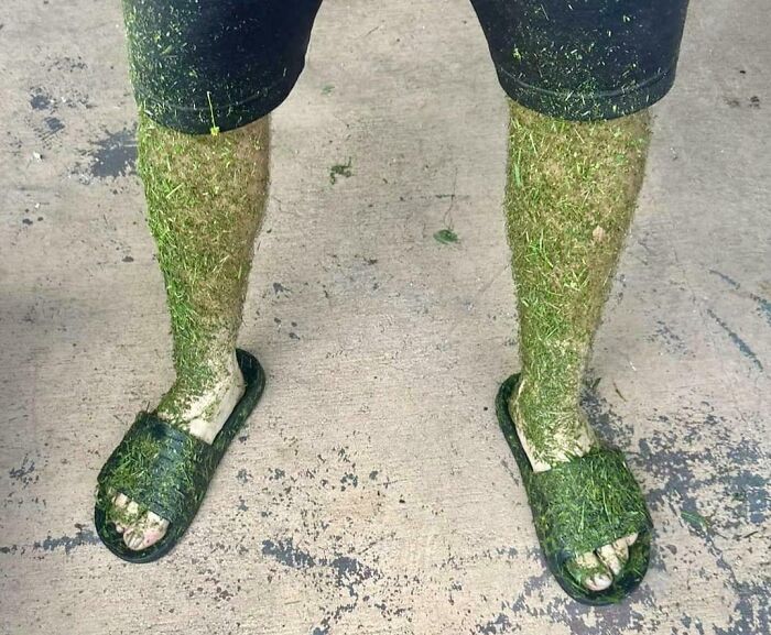 Moje nohy po kosení trávnika, kým bol ešte mokrý