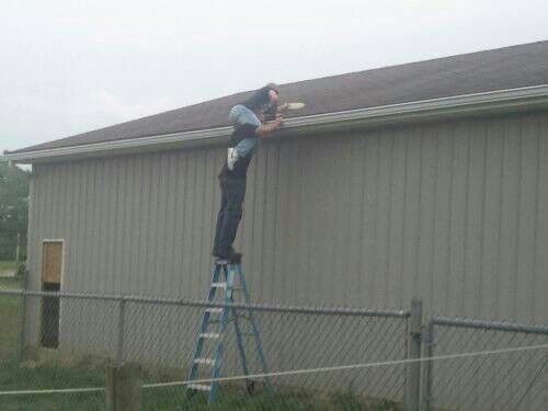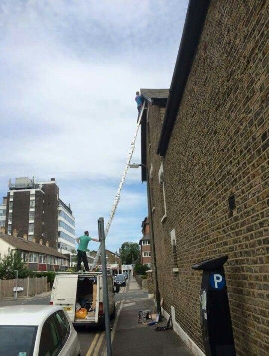 Obrovský rebrík je držaný spôsobom, ktorý je nebezpečný a vôbec nevyzerá stabilne.