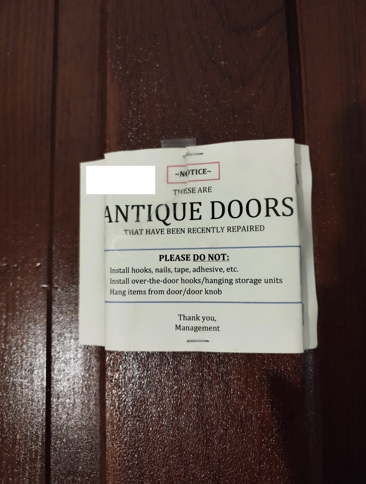 Prenajímateľ pripevnil oznam o ochrane starožitných dverí priamo ich poškodením, čím dosiahol presný opak.
