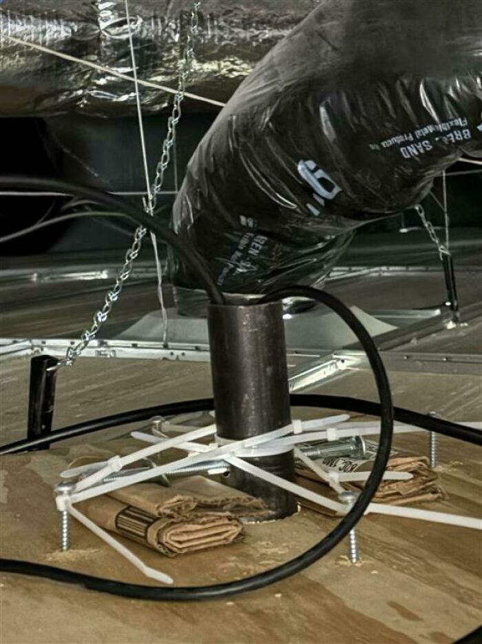 Toto sme našli v našej kancelárii. Na tejto tyči je zavesený dataprojektor, ktorý nie je ľahký. Naozaj nás to prekvapilo a necítime sa bezpečne. Komu to vôbec napadlo?