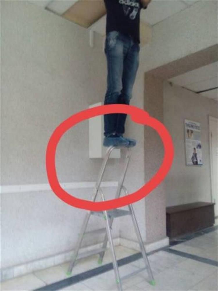 Človek stojí na malom rebríku veľmi nebezpečne, aj keď by bolo oveľa jednoduchšie použiť väčší.