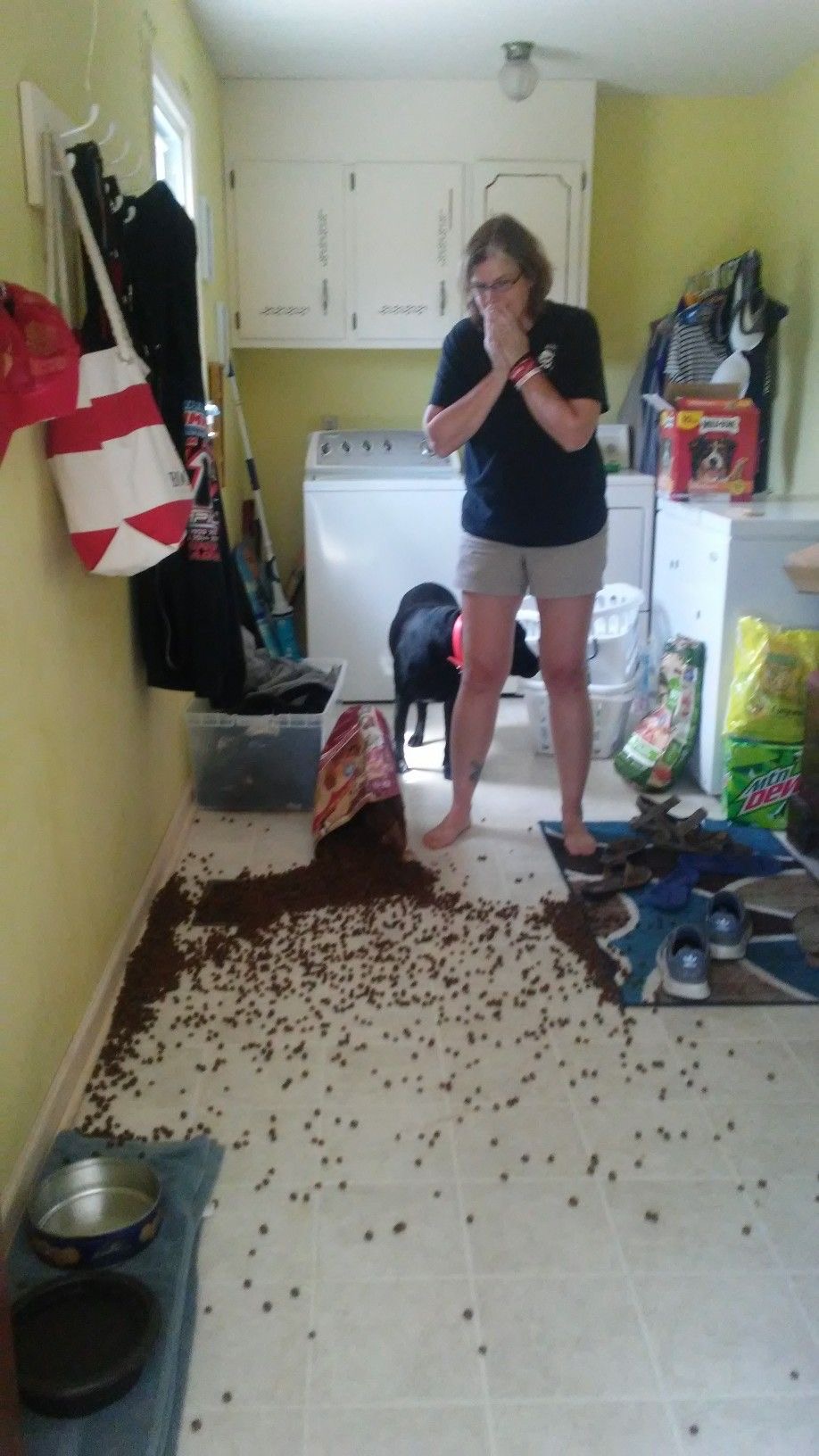 Rozsypané psie jedlo na podlahe znamená nečakanú hostinu pre domáceho miláčika.