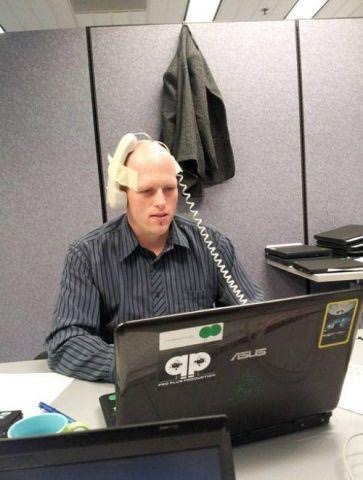 Telefón pripevnený k hlave pôsobí ako extrémny dôsledok pracovného nasadenia.