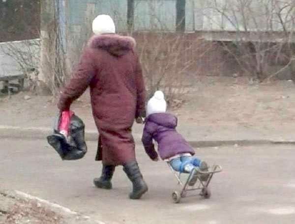 Dieťa je ťahané spôsobom, ktorý naznačuje, že už ho unavuje byť dieťaťom.