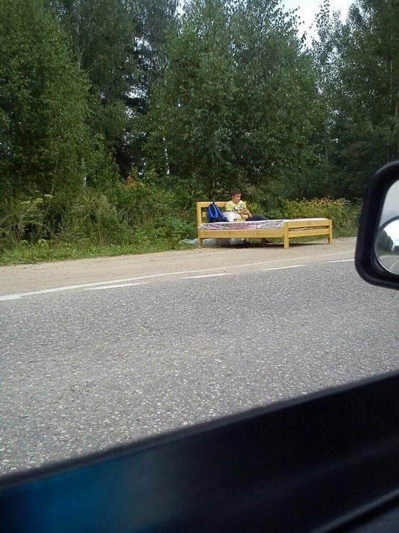 Človek spí priamo na ulici, no prekvapivo vyzerá veľmi pohodlne.