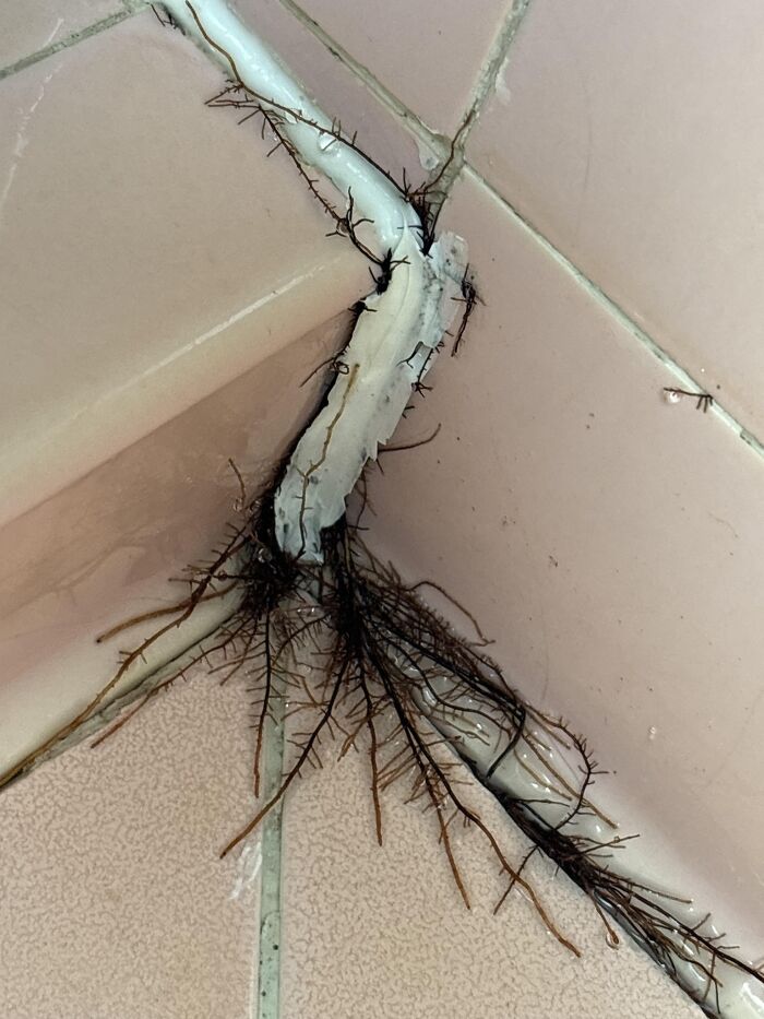 Toto rástlo v mojom kvetináči, čo to je? Je to vláknité a elastické, vybral som to a dal do vrecka, bolo to prilepené k hlinenému kvetináču a škrobené viac ako meter, kým som to nevytrhol. Nezdalo sa, že by to rástlo zo zeme a ani sa to nepohlo. Kus má asi 10 cm krát 6 cm